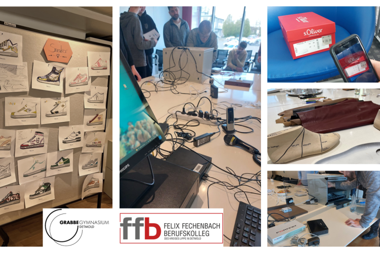 Zusätzlich wurde unsere Kooperation mit dem Grabbe Gymnasium in Detmold nach coronabedingter Pause reaktiviert. Nach einer kurzen Unternehmensvorstellung und einem Einblick in unser Azubi-Leben widmeten wir uns gemeinsam mit dem Kunst Leistungskurs dem Bereich Produktmanagement. Dabei wurden unseren Besucher*innen sowohl die typischen Aufgaben des Produktmanagements als auch die Entstehung eines Schuhs von der ersten Idee bis hin zum fertigen Produkt veranschaulicht. Nach diesem theoretischen Einblick waren die Schüler*innen selbst gefragt und durften einen eigenen Sneaker anhand einer vorgegebenen Sohle designen. Es wurde direkt losgelegt und bereits nach kürzester Zeit entstanden erste eindrucksvolle Kunstwerke.