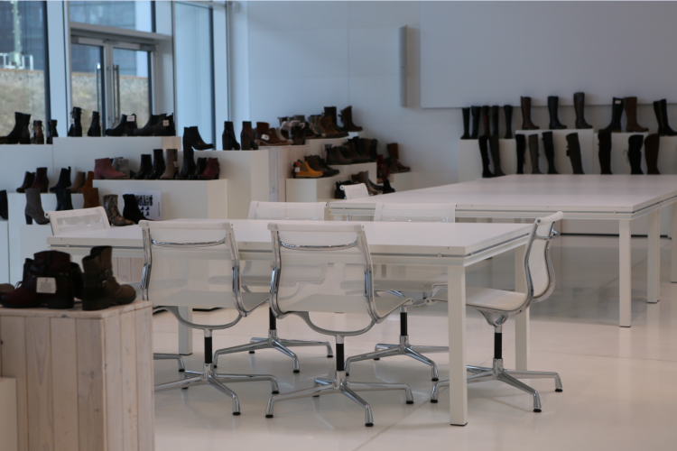 Nach einem kurzen Kräftetanken im Hotel befanden wir uns dann am nächsten Morgen auch endlich auf dem Weg zum Kunden. Durch den morgendlichen Hamburger Berufsverkehr fuhren wir mitten in die Innenstadt, um unser Auto in einem kleinen Hinterhof zu entladen und die Schuhkoffer per Aufzug in die Zentrale des Kunden zu schicken. Dort packten wir die Koffer in einem kleinen Showroom aus und stellten die Schuhe nach Themen sortiert auf, sodass der Kunde gleich einen Eindruck und Überblick von unseren Schuhen bekommen konnte. Schuhe aufgebaut, Unterlagen parat, Hemd und Sakko gerichtet – es konnte also losgehen. Nach einer kurzen Begrüßung und einem Gespräch über vorherige und aktuelle Kollektionen, stellte Herr Schnittger die Kollektion in allen Einzelheiten vor und zeigte dem Kunden die Details und Vorteile der verschiedenen Schuhe. Wir notierten die Artikelnummern der Schuhe, die dem Kunden gefielen, sodass später ein Angebot zu diesen Schuhen erstellt werden konnte. Nach ungefähr drei Stunden guter und intensiver Gespräche über Absätze, Materialien und Details war der Kundentermin zu Ende.